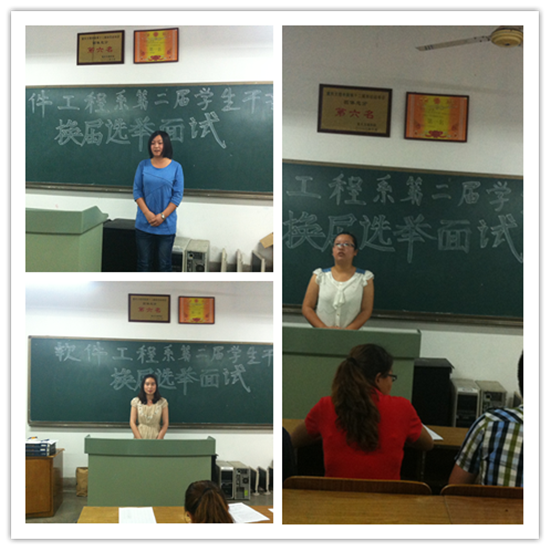 2013年5月20日19:20,软件工程与服务外包系第二届学生干部换届选举面试在1309教室举行。出席此次大会的有系团总支书记向术桃,系主任秘书罗晓兰老师以及大二的学生代表,向术桃书记主持本次大会。