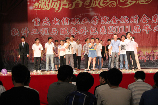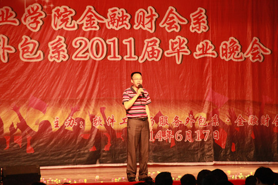 6月17日晚19:00,由软件工程与服务外包系和金融财会系联合主办的2014届毕业生欢送晚会在活动中心四楼隆重举行。学校副校长王成玮、副书记白成良、副校长钟代军、学生处、团委、就业处相关领导及两系师生共计600余人观看了本次晚会。