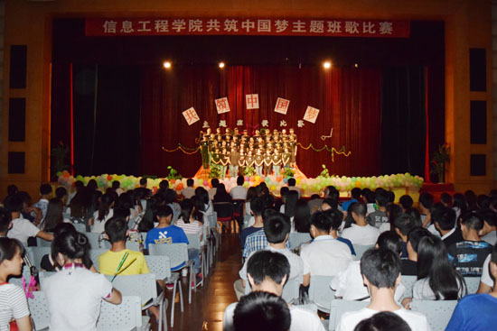 为了弘扬中国精神和培养大学生的爱国意识,也为了活跃校园文化气氛,丰富电信学子的课余生活,为广大学生提供展示自己的机会,展现当代大学生的蓬勃朝气、团结一致的精神风貌,建设和谐友爱的大学校园。重庆电信职业学院信息工程学院于2015年6月11日晚在活动中心四楼成功开展了“共筑中国梦”主题班歌比赛。参加本次活动的领导及老师有设计与建筑学院党支部书记向术桃、信息工程学院党支部书记寇亚丽、团总支书记卢飞、学工部综合科科长王向前及专职老师、辅导员老师们。