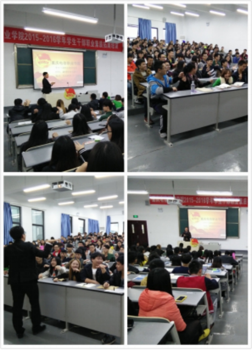 2015年11月24日中午,全校学生干部职业素质拓展培训大会在龙水湖二阶教室召开,我院全体学生干部共计50余人参加培训,大会由电信职业学院学工部部长、校团委书记代敏老师主持。