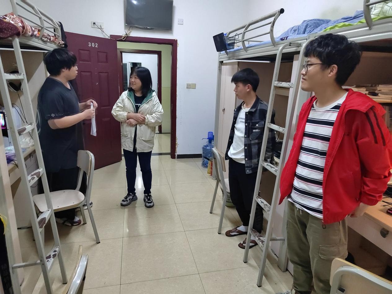 为杜绝安全隐患,营造安全、干净、舒适的学生宿舍环境,2022年4月28日晚,物联网与通信学院党支部书记侯周兰和各年级辅导员深入学生宿舍检查内务卫生、排查安全隐患等问题。